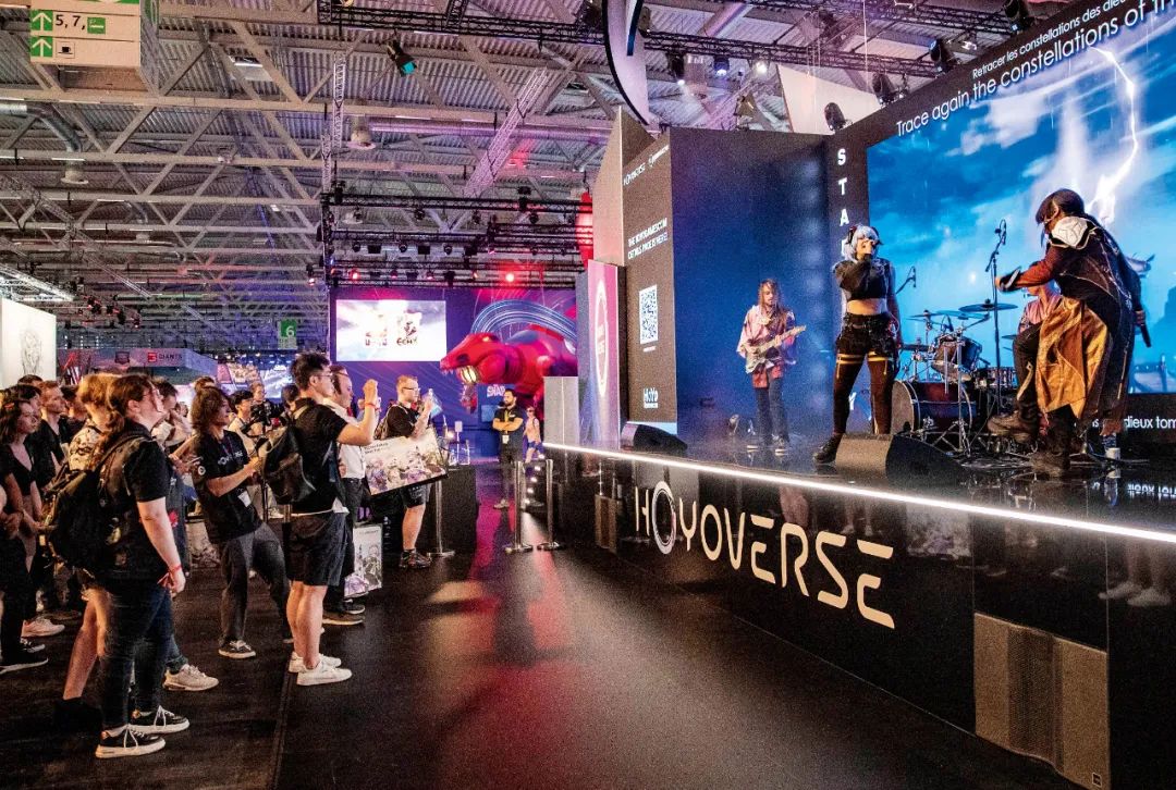 2023年8月23日,,,德國科隆游戲展期間,,,,人們在米哈游展臺觀看樂隊表演游戲歌曲。。。圖/新華